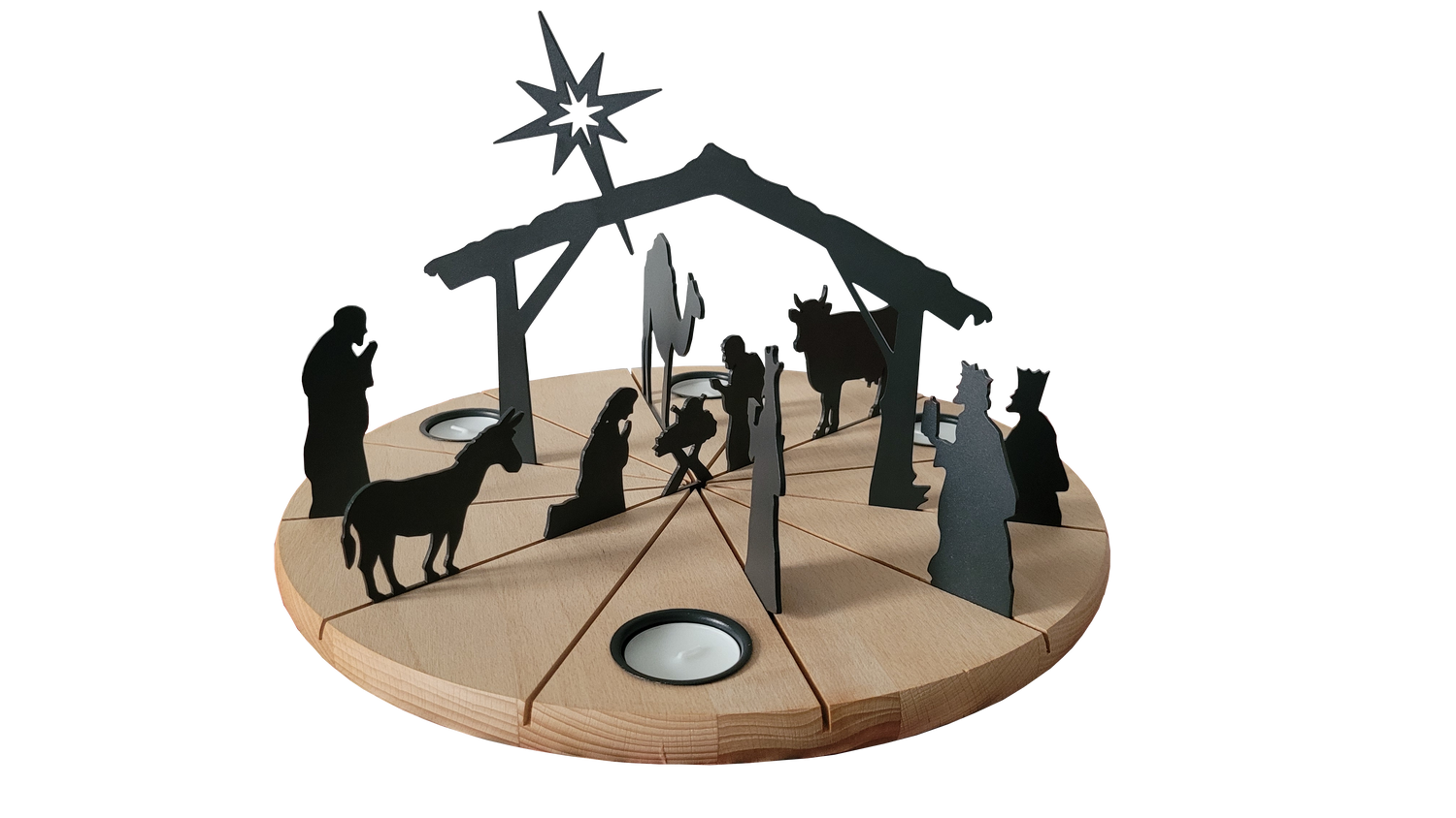 Für unsere beliebte moderne Weihnachtskrippe haben wir uns dieses Jahr für eine Neuauflage entschieden und dabei eure Anmerkungen berücksichtigt. Nunmehr können vier Teelichter verwendet werden, sodass die Krippe auch als moderner Adventskranz genutzt werden kann.Eine kleine Veränderung mit enormer Wirkung!