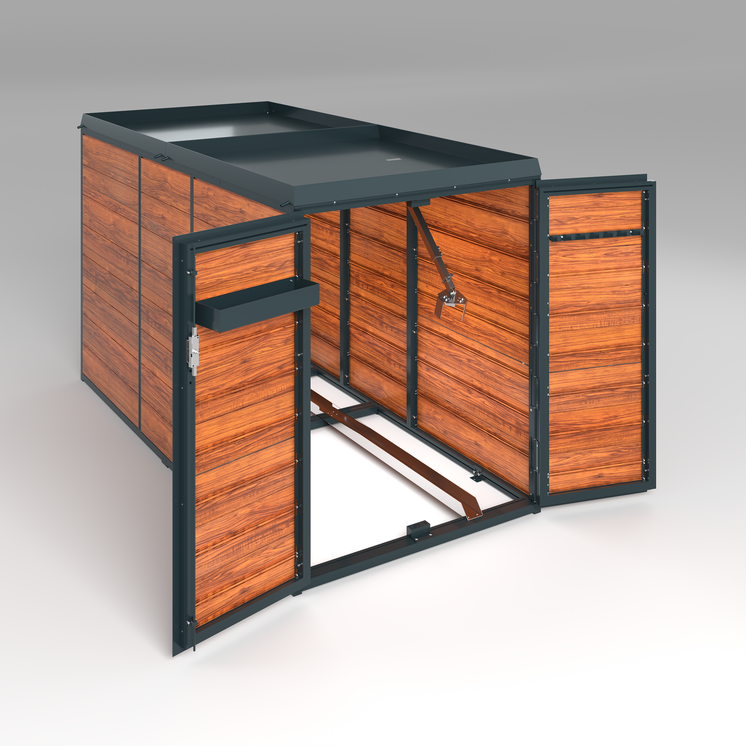 Das Design macht diese Lastenradgarage zu einem echten Hingucker vor Ihrem Haus. Verschiedene Oberflächendesgins, kombiniert mit der Sicherheit einer Garage, bieten jedem Lastenrad eine sichere Unterstellmöglichkeit.