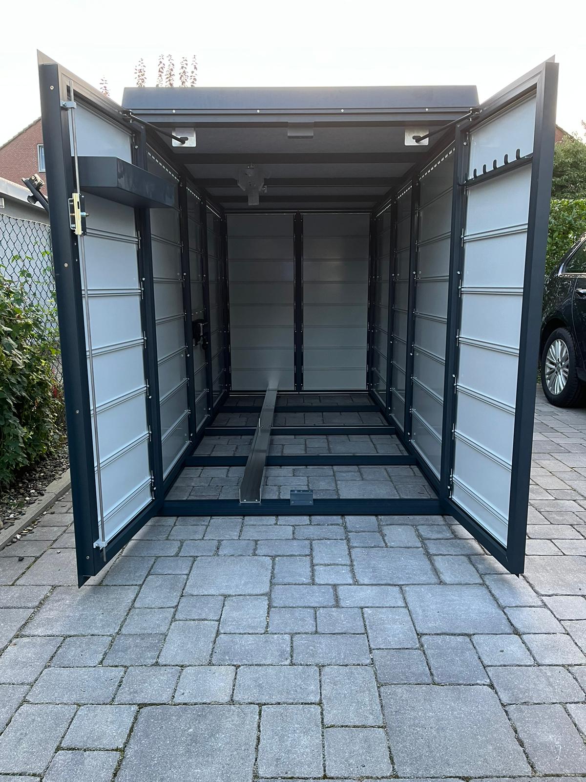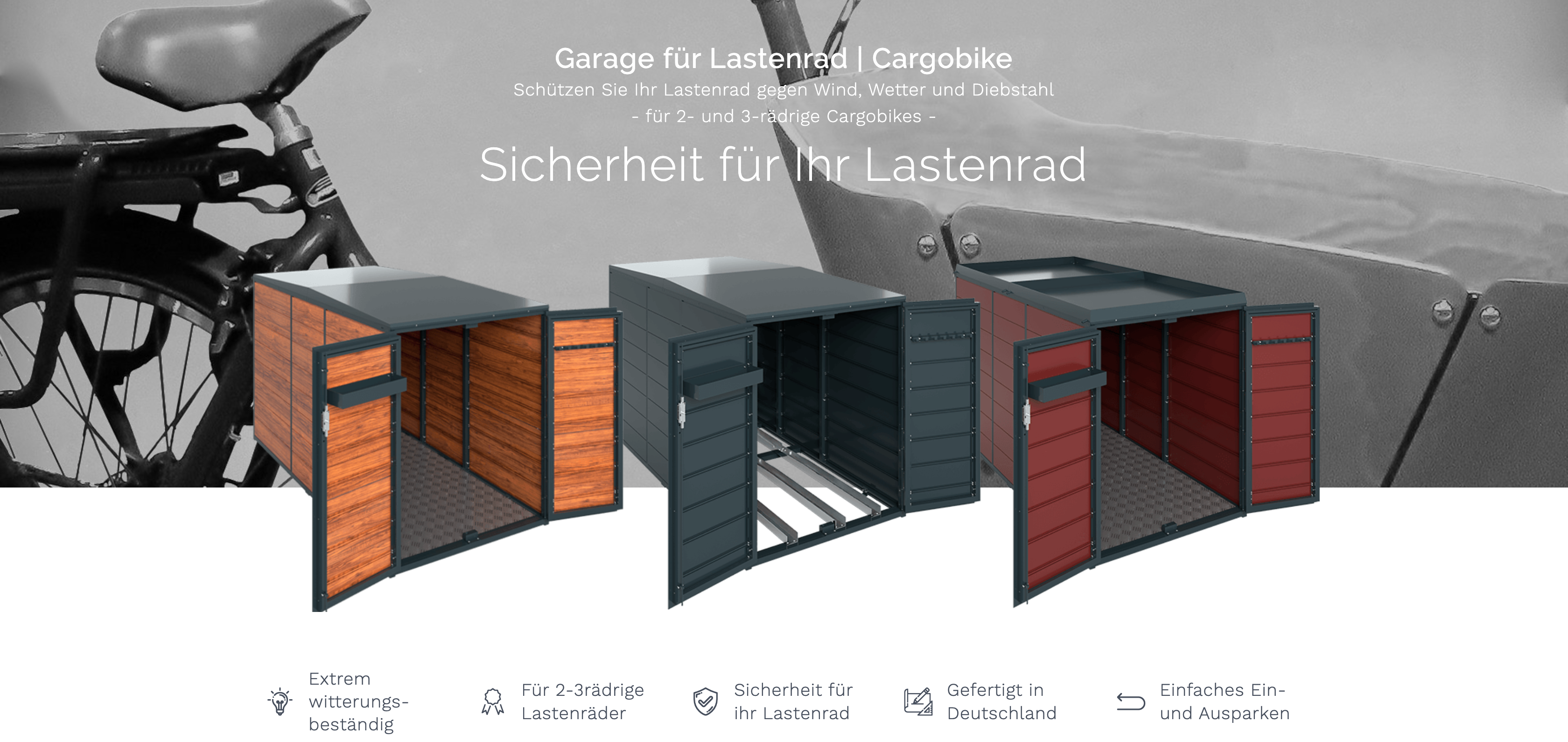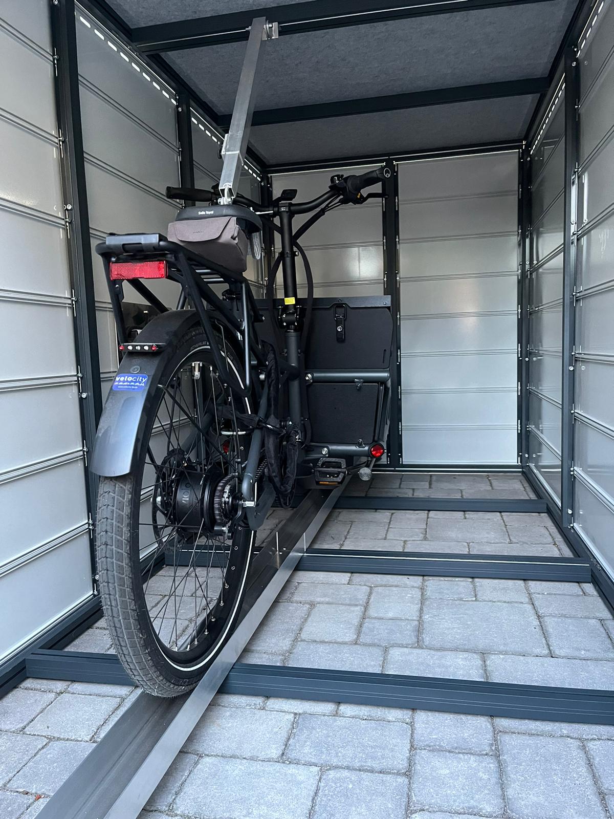 La construction intelligente du garage à vélo cargo en aluminium garantit que vous pouvez facilement insérer votre vélo cargo (vélo cargo) dans le coffre. Les vélos cargo peuvent être facilement insérés grâce à un système de rails au sol. Les coffres pour vélos cargo à deux roues disposent également d'un porte-selle qui se fixe sous le toit et peut être réglé pour chaque selle et rabattable.
