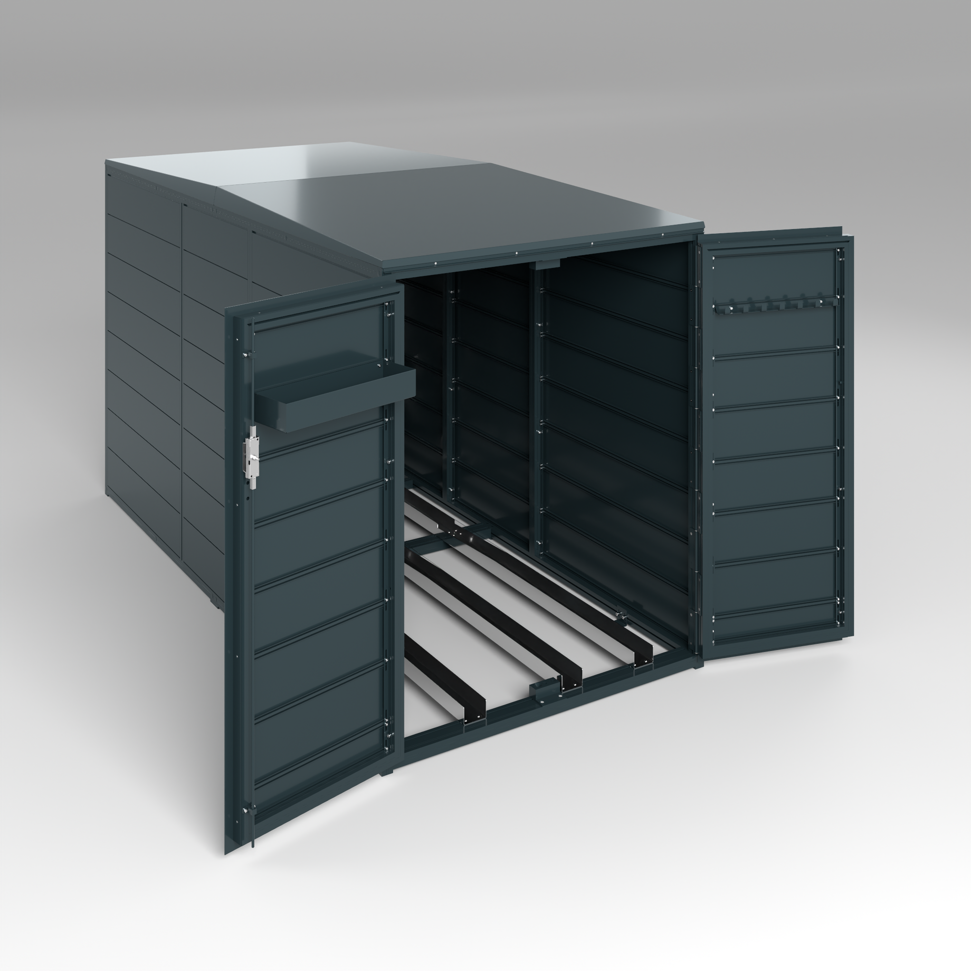 Sie finden hier sorgenfreie Abstellmöglichkeiten für Ihr Lastenrad. Neben dem umfänglichen Schutz vor Verwitterung, beugen Sie insbesondere Diebstahl vor. Die Tür wird dabei gesichert über ein robustes Stangenschloss mit Kipphebel. Versicherungen stufen diese Schließtechnik hinsichtlich der Sicherheit als vergleichbar ein wie eine Kellertür. Daher Ihr Lastenrad in einer verschlossenen Box über die Hausratversicherung versichert.